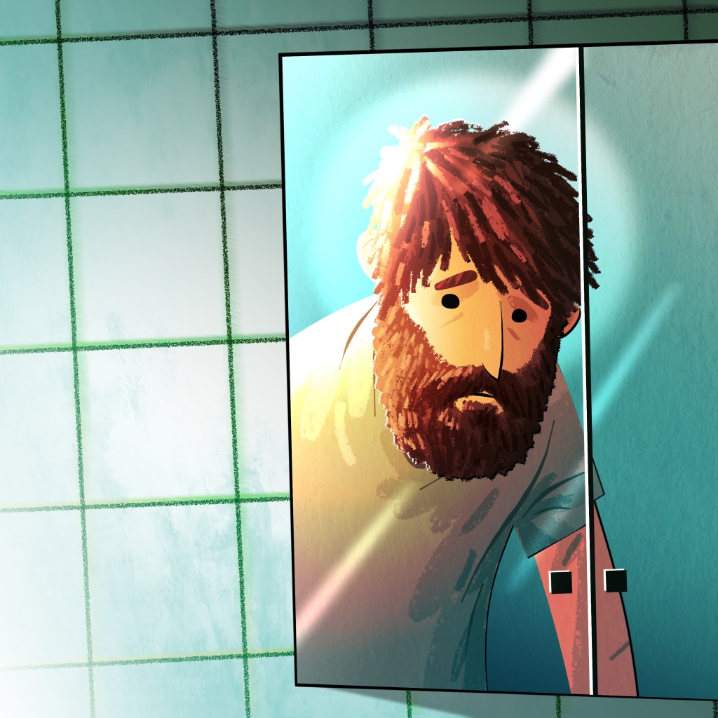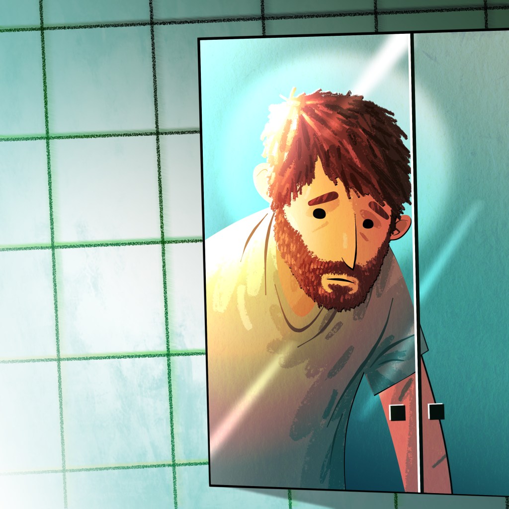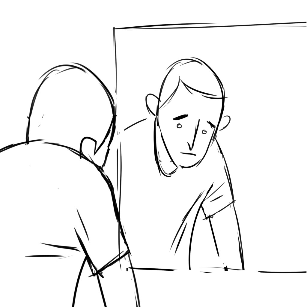 Below is the initial sketch, which was to feature the man looking into the mirror. I cut him as I realised that you are the man looking at your reflection.